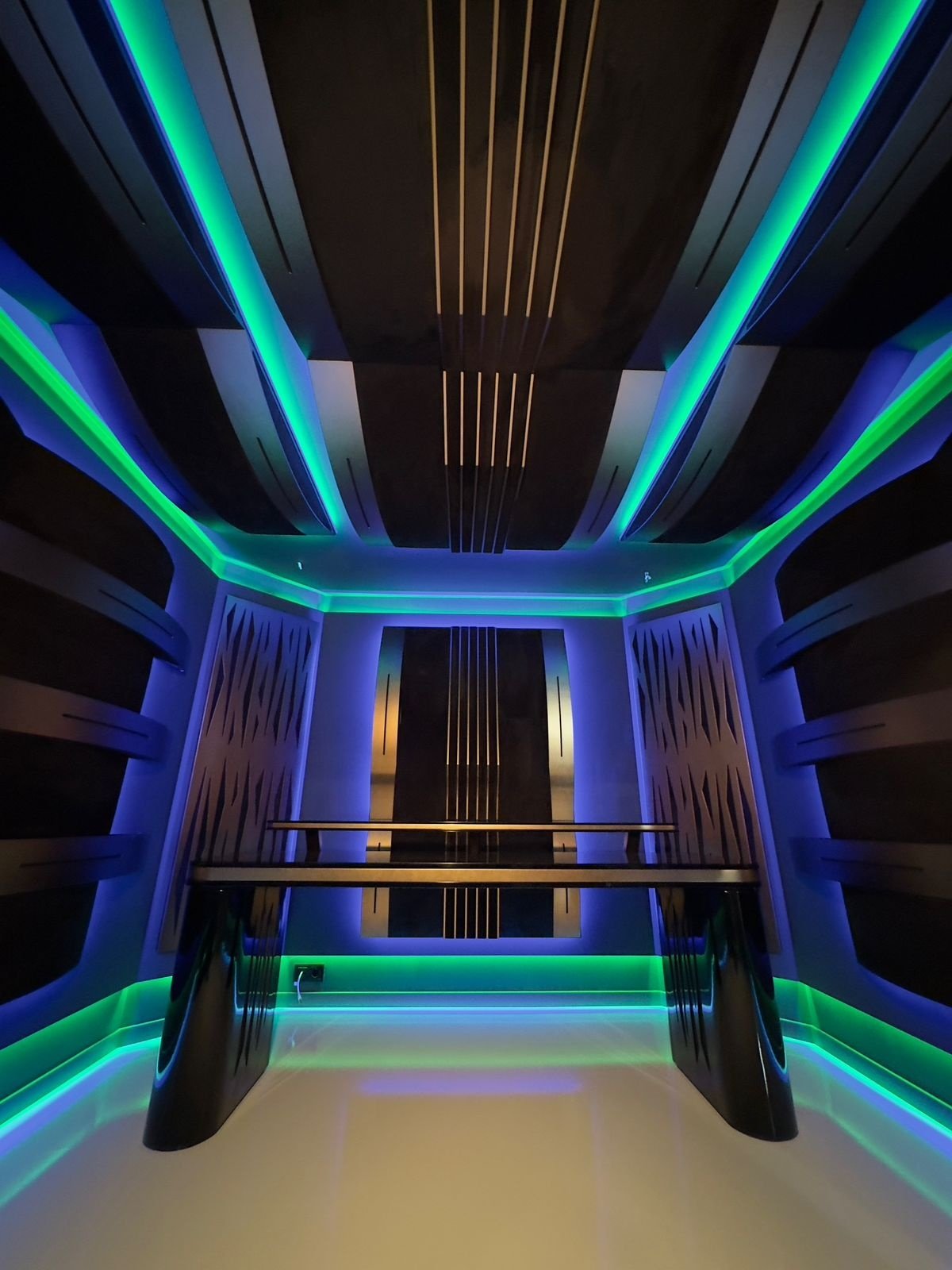 Die Beleuchtung im Musikstudio besteht aus einer Kombination aus linearen Lichtlinien und indirekter Beleuchtung. Die Anwendung von LED-Streifen mit hohem Farbwiedergabeindex (CRI95) garantiert eine naturgetreue Farbdarstellung, die in kreativen Umgebungen von entscheidender Bedeutung ist.