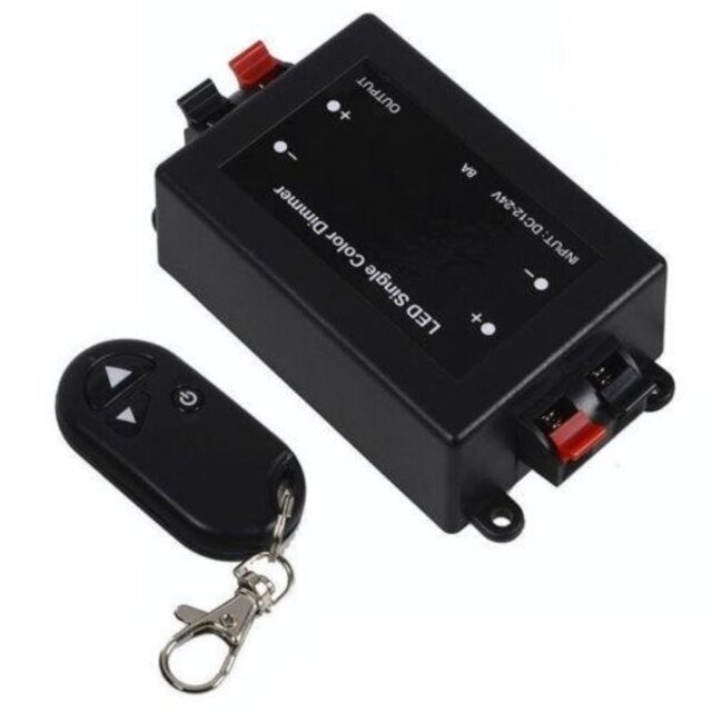 Ein günstiges und zuverlässiges Set bestehend aus einem drahtlosen LED-Dimmer und einer Fernbedienung zum Ein-, Ausschalten und Dimmen von LED-Streifen im Bereich 12 V/24 V bis 8 A.