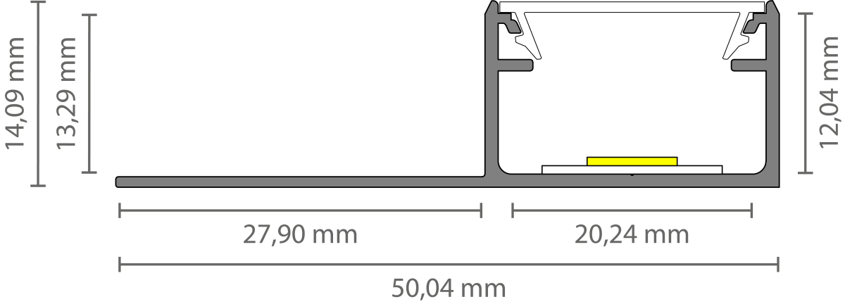 LED-Trockenbauprofil mit opaler Klickabdeckung, 50,14 mm x 14,09 mm – T3H Homam | LED-Streifen-Einbauprofil für Gipskartonplatten, präzise Maße nach DIN-Norm, inklusive opaker Abdeckung für gleichmäßige Lichtverteilung