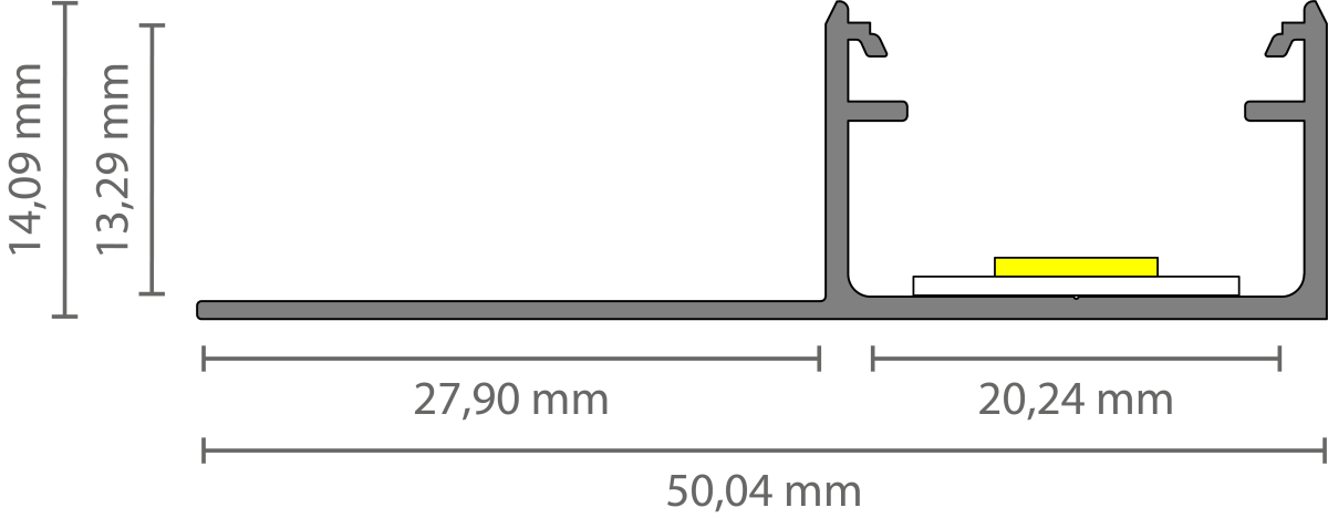 LED-Gipsplattenprofil mit opaker Klickabdeckung, 50,14 mm x 14,09 mm – GIPS300 | LED-Streifen-Einbauprofil für Gipskartonplatten, präzise Maße nach DIN-Norm, inklusive opaker Abdeckung für gleichmäßige Lichtverteilung