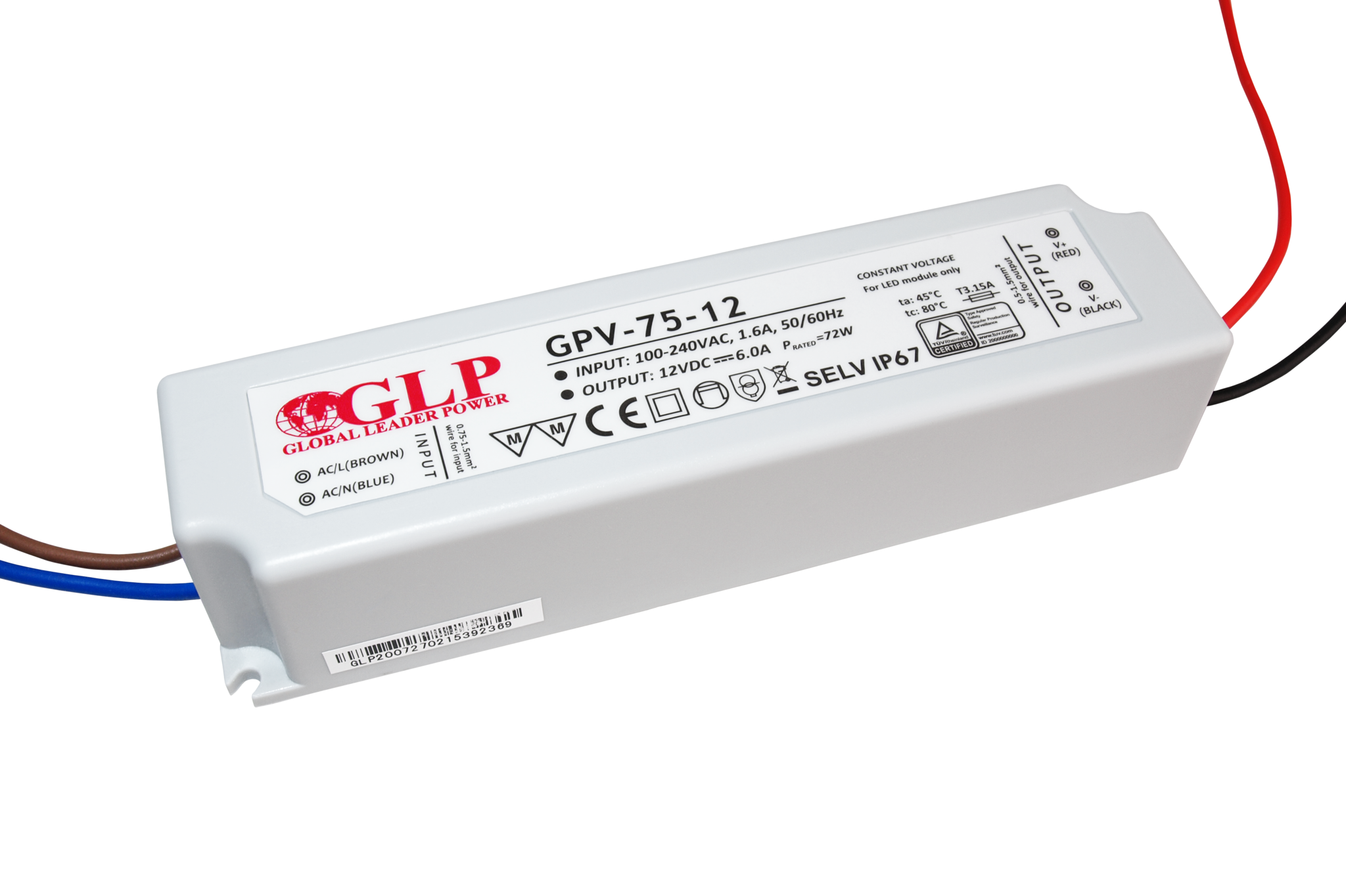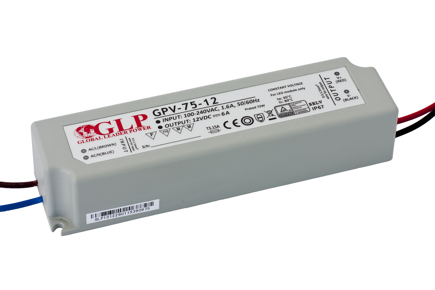 75W 12V 6A LED-Netzteil IP67 wasserdicht – GLP GPV-75-12 – Stromversorgung für LED-Streifen, 12 Volt Gleichstrom, 6 Ampere, staub- und wasserfest