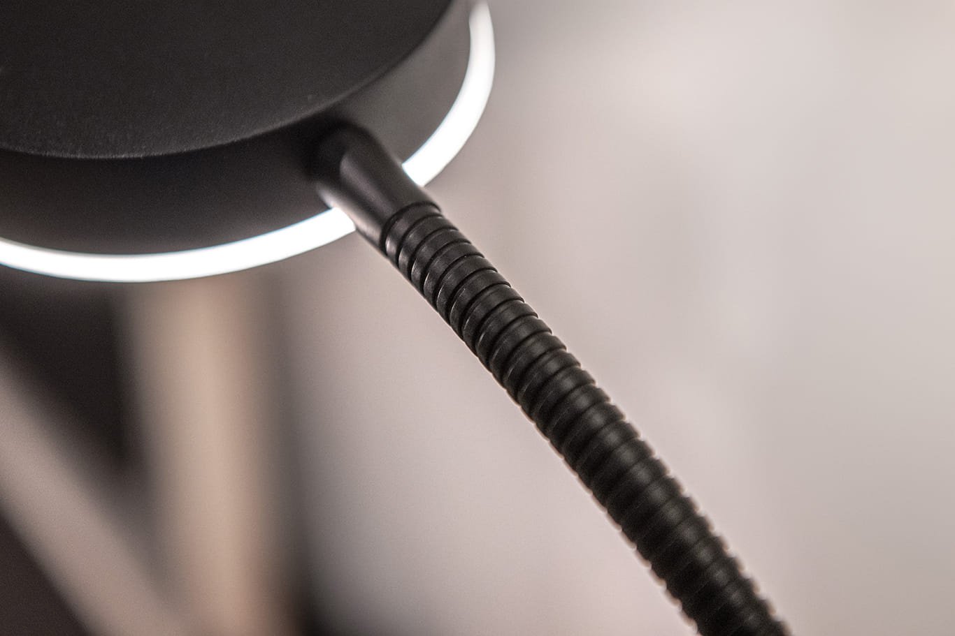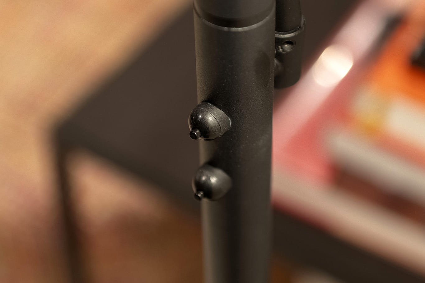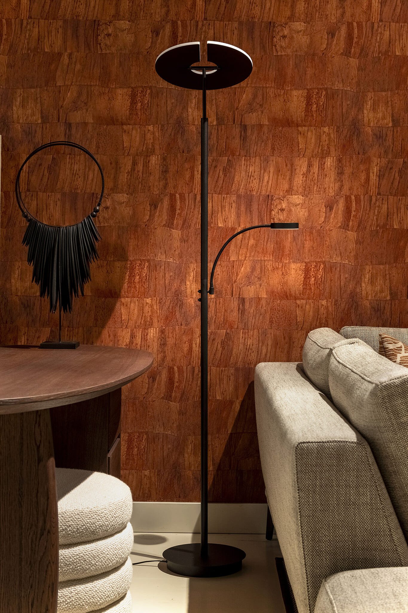 Beide Lichtquellen sind dimmbar über separate Pulsdimmer an der Stange, sodass Sie die Lichtintensität individuell anpassen können. Die schwenkbare Schale des Uplighters ermöglicht zusätzlich eine flexible Lichtausrichtung.