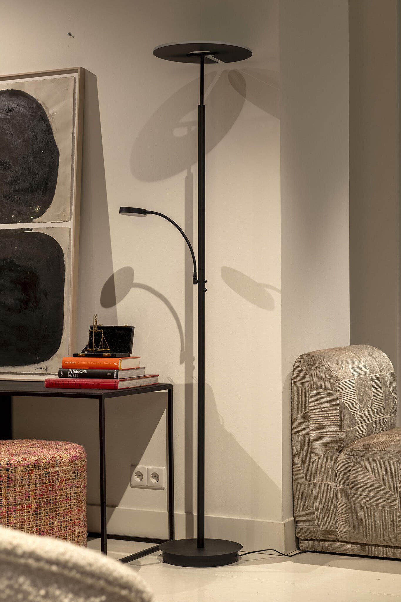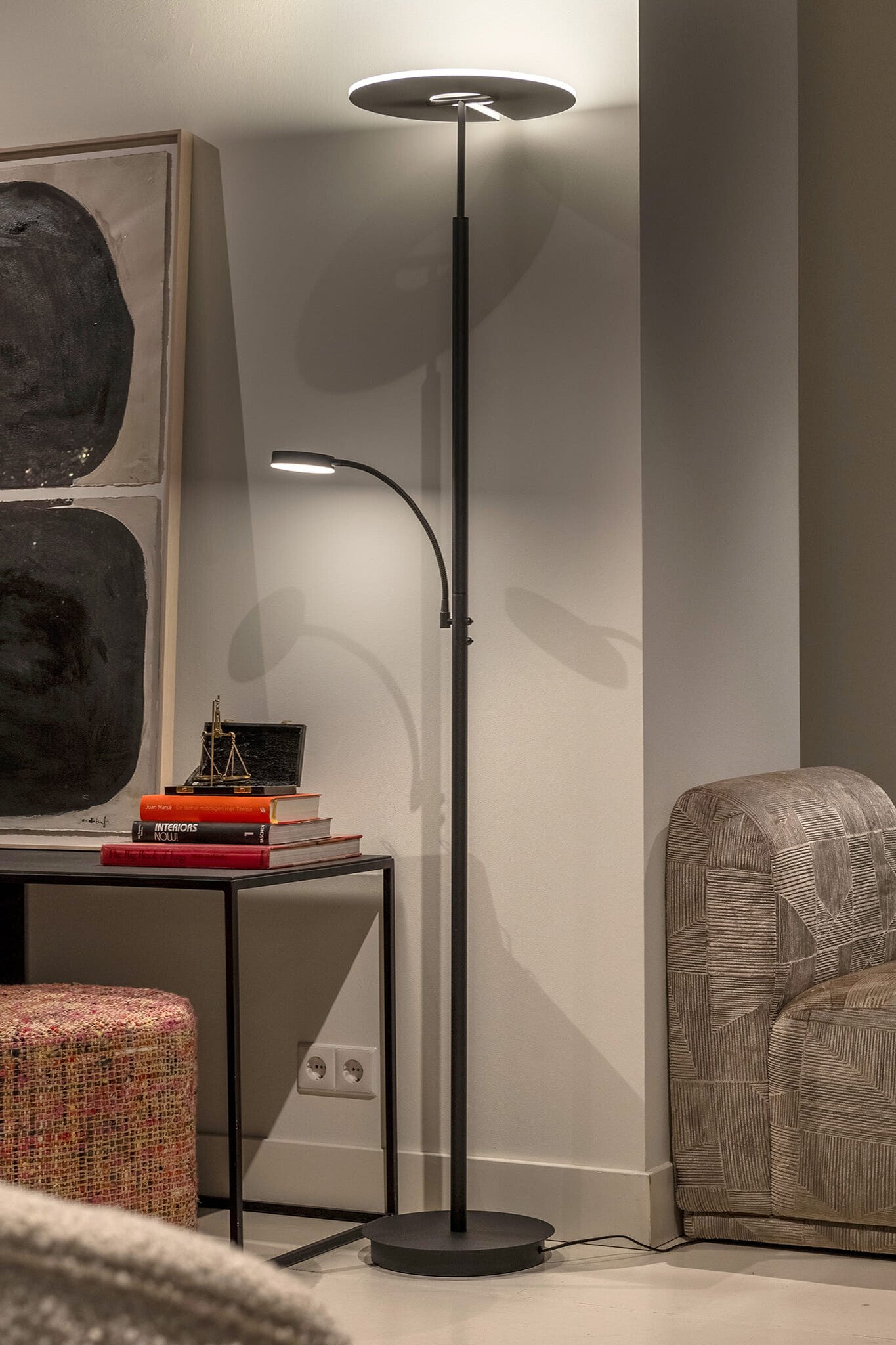 Moderne LED Stehleuchte mit integrierter Leseleuchte in Schwarz. Dimmbar, warmweiß bis neutralweiß (2200K–3500K), 30W + 6W LED, 3140lm Gesamtlichtstrom. Ideal für Wohnräume.