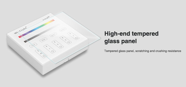 [embed]https://www.youtube.com/watch?v=u-61KDvihOo 4-Zone RGB RGBW Smart Panel Remote Controller - B3 Mi-light 2.0 Diese hochwertige oplossing zur Steuerung von RGB / RGBW / RGBWW & Einfarbigen LED Streifen besteht aus erstklassigen Materialien. Die Farbauswahl erfolgt einfach per Touch, und die Steuerung kann in bis zu 4 Zonen unterteilt werden. Die Dimmung ist von 0,01 % bis 100 % möglich, sodass Sie unbegrenzte Möglichkeiten zur Lichtgestaltung haben. Diese LED Einbaudimmer ist mit all unseren RGB / RGBW / RGBWW & Einfarbigen LED Streifen kompatibel. Steuern Sie unsere Controller mit diesem komplett kabellosen 4-Zonen-Wanddimmer mit kratzfreiem Touch-Panel. Zusätzlich zur Wandsteuerung kann auch die 4-Zonen-Fernbedienung verwendet werden. Weitere LED Streifen entdecken